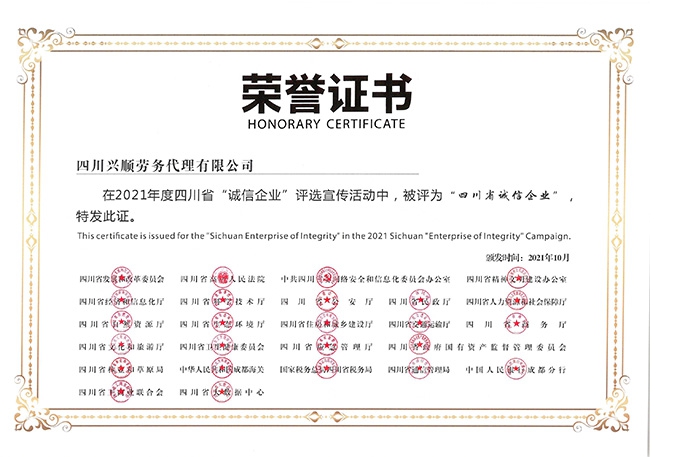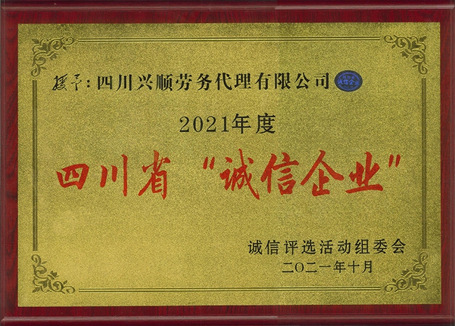 熱烈祝賀四川興順勞務(wù)代理有限公司獲2021年度四川省“誠信企業(yè)”稱號(hào)