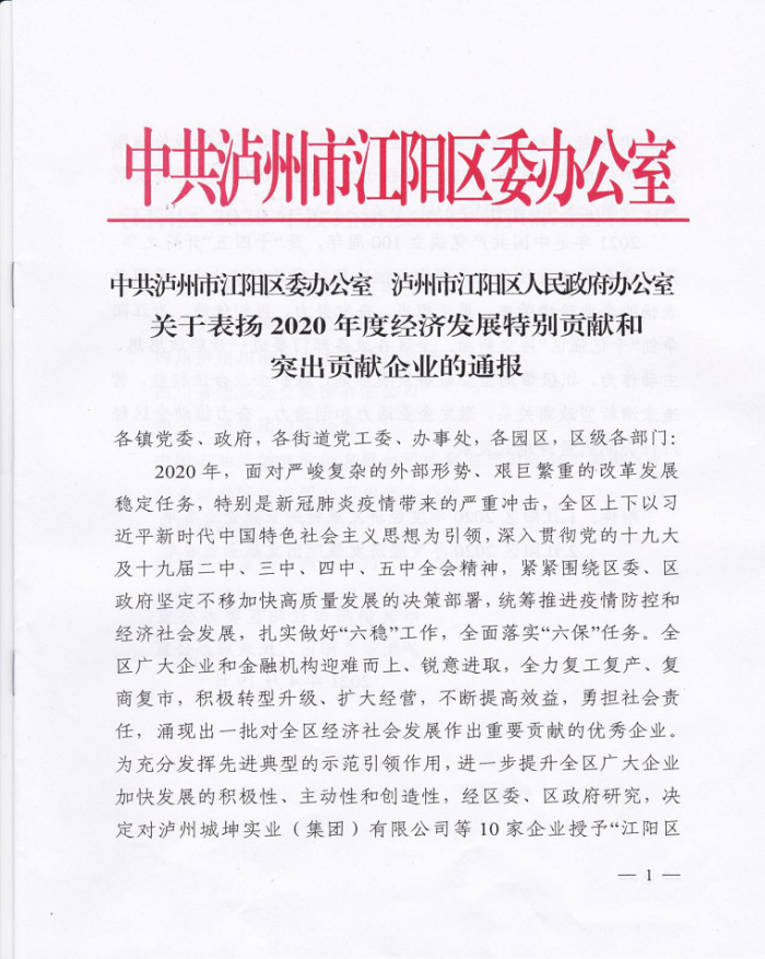2021年4月20日上午,中共瀘州市江陽區(qū)委、瀘州市江陽區(qū)人民政府在江陽會議中心召開2021年區(qū)委經(jīng)濟工作會議,會議隆重表彰了在2020年為江陽區(qū)經(jīng)濟發(fā)展作出特別貢獻的優(yōu)秀企業(yè)10家,作出突出貢獻的優(yōu)秀企業(yè)60家,其中四川興順勞務(wù)代理有限公司再一次榜上有名,榮獲“瀘州市江陽區(qū)2020年度經(jīng)濟發(fā)展突出貢獻獎”榮譽稱號。
