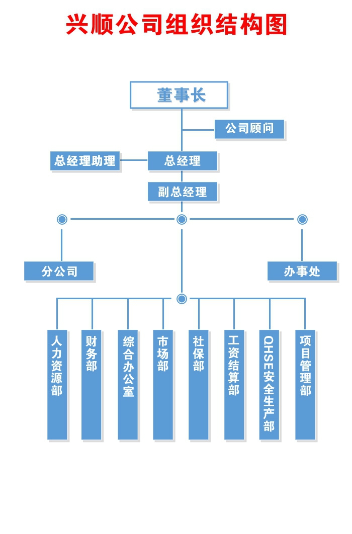公司下設(shè)有:四川興順勞務(wù)代理有限公司成都分公司、四川興順勞務(wù)代理有限公司物業(yè)服務(wù)分公司、敘永辦事處、貴陽辦事處、云南辦事處、廣西辦事處、德陽辦事處、百色辦事處、赤水辦事處、川中公管中心南充辦事處;四川金帆建筑勞務(wù)有限公司各工程項(xiàng)目部。公司內(nèi)設(shè)有:公司辦公室、財(cái)務(wù)部、人力資源部、市場(chǎng)部、外包業(yè)務(wù)管理部、QHSE安全生產(chǎn)部、工資及社會(huì)保險(xiǎn)管理部、顧問辦公室等職能部門。